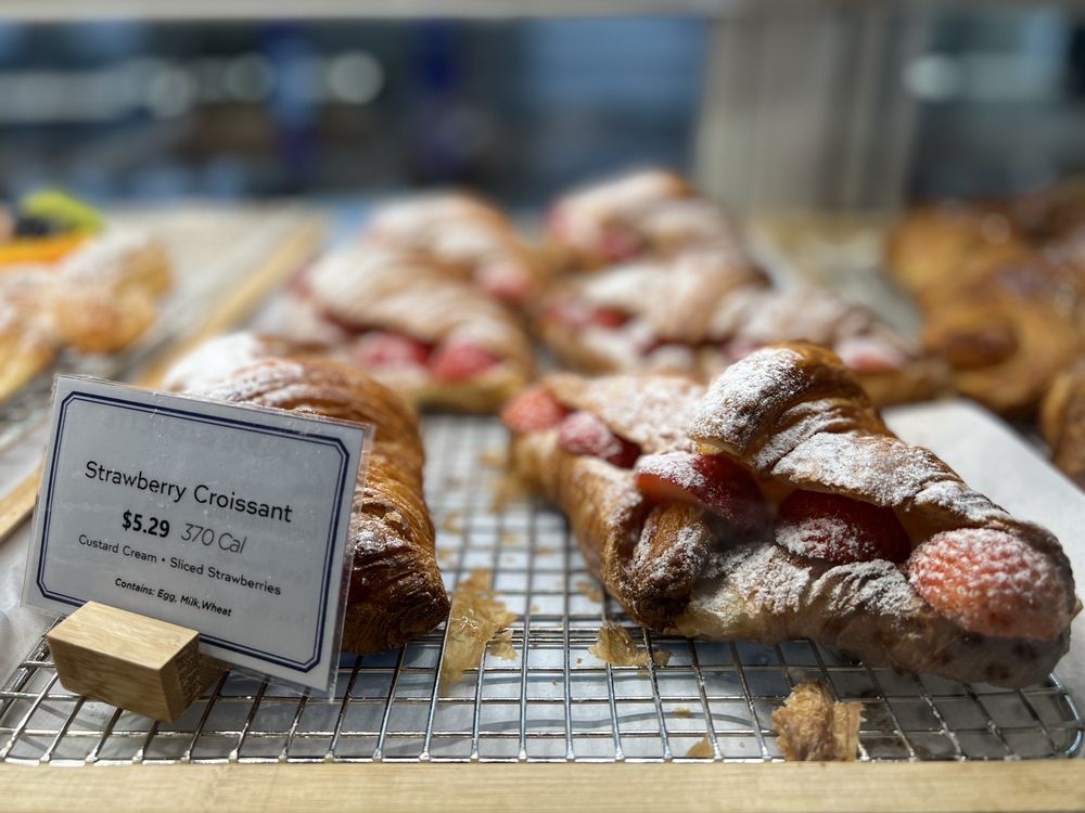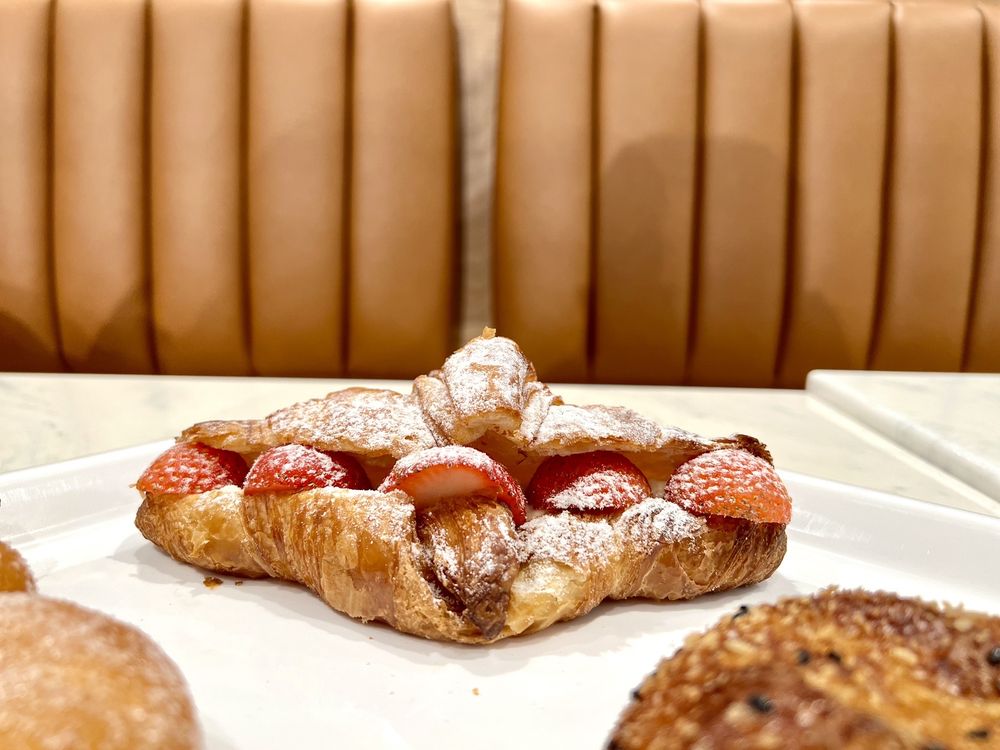 Croissant filled with soft custard cream and strawberries, dusted with powdered sugar.Contains: Egg, Milk, Wheat